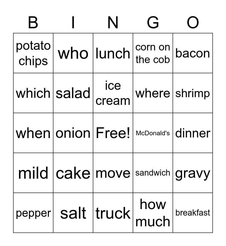 This bingo card has a free space and 36 words: poneapple, peach, apple, salad, sandwich, mild, ice cream, dessert, bacon, watermelon, onion, corn on the cob, taco, McDonald's, shrimp, potato chips, jelly, cake, breakfast, lunch, dinner, gravy, salt, pepper, truck, who, when, what, where, which, why, closed caption, how much, move, read and traffic.