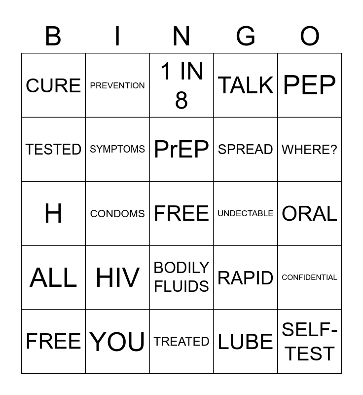 This bingo card has a free space and 25 words: HIV, TREATED, PrEP, FREE, PEP, CURE, TESTED, PREVENTION, UNDECTABLE, BODILY FLUIDS, SPREAD, H, RAPID, CONFIDENTIAL, SYMPTOMS, BLOOD, ORAL, 1 IN 8, WHERE?, CONDOMS, SELF-TEST, YOU, ALL, TALK and LUBE.