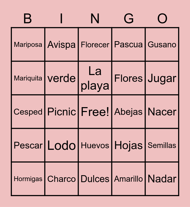 This bingo card has a free space and 24 words: Lodo, Charco, La playa, Hormigas, Gusano, Mariposa, Mariquita, Avispa, Abejas, Huevos, Flores, Cesped, Hojas, Semillas, verde, Amarillo, Nacer, Florecer, Jugar, Picnic, Nadar, Pescar, Pascua and Dulces.