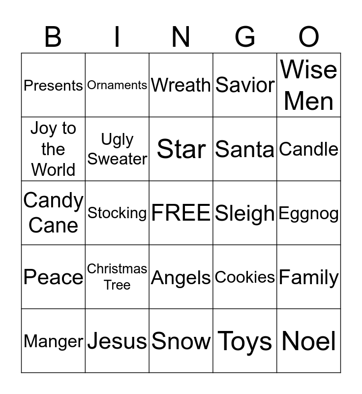 This bingo card has a free space and 24 words: Christmas Tree, Jesus, Star, Manger, Wise Men, Presents, Joy to the World, Ornaments, Sleigh, Angels, Santa, Candy Cane, Cookies, Family, Ugly Sweater, Toys, Eggnog, Wreath, Candle, Stocking, Noel, Peace, Savior and Snow.