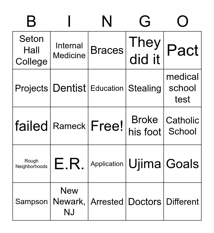 This bingo card has a free space and 29 words: Sampson, George, Rameck, University High School, Seton Hall College, Braces, Dentist, E.R., Broke his foot, New Newark, NJ, Catholic School, Different, Arrested, Doctors, medical school test, Ma, Application, Rough Neighborhoods, Pact, failed, Ujima, Teacher, Stealing, Projects, They did it, Internal Medicine, Goals, Education and Dayton Street.