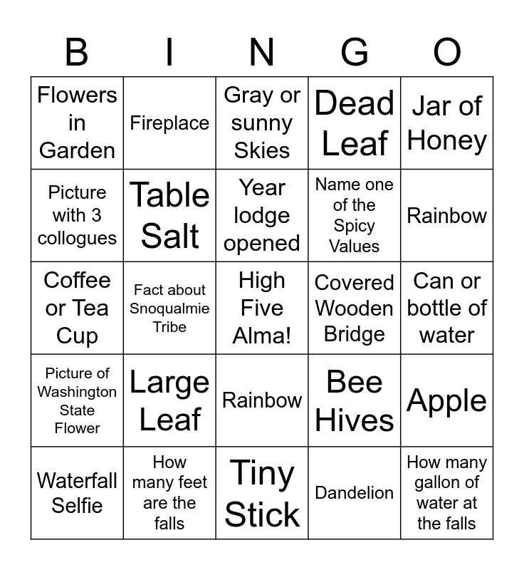This bingo card has a free space and 24 words: Waterfall Selfie, Large Leaf, Year lodge opened, Dandelion, Jar of Honey, Flowers in Garden, Fireplace, Gray or sunny Skies, Covered Wooden Bridge, Can or bottle of water, Coffee or Tea Cup, Table Salt, Bee Hives, Apple, Picture with 3 collogues, How many feet are the falls, Tiny Stick, Dead Leaf, Rainbow, Picture of Washington State Flower, Fact about Snoqualmie Tribe, Rainbow, Name one of the Spicy Values and How many gallon of water at the falls.
