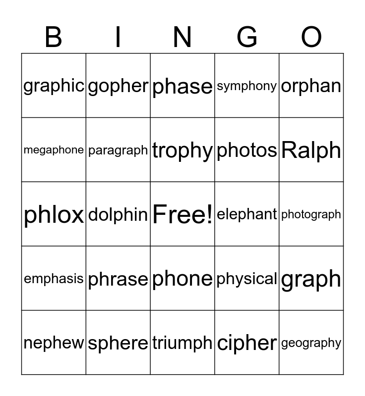 This bingo card has a free space and 24 words: phrase, sphere, trophy, nephew, orphan, graphic, megaphone, gopher, elephant, phone, photos, phlox, physical, graph, paragraph, cipher, photograph, phase, Ralph, dolphin, geography, emphasis, symphony and triumph.