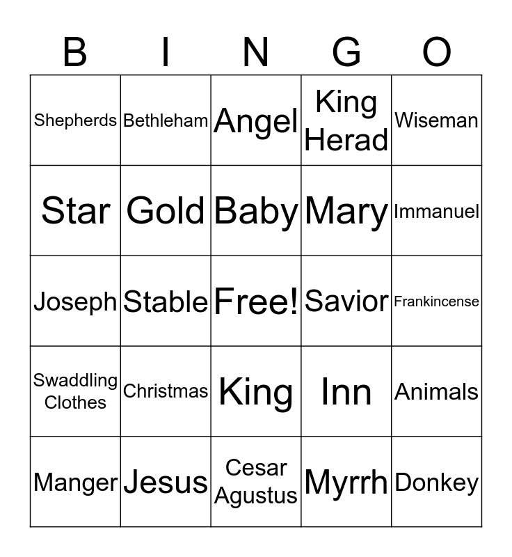 This bingo card has a free space and 24 words: Christmas, Jesus, Baby, Manger, Wiseman, Shepherds, Star, Bethleham, Savior, King, Mary, Joseph, Inn, Animals, Gold, Myrrh, Frankincense, Angel, Immanuel, Stable, Donkey, Swaddling Clothes, King Herad and Cesar Agustus.
