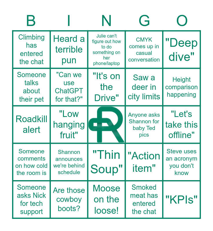 This bingo card has a free space and 28 words: Steve uses an acronym you don't know, Someone's partner/kid calls because they can't find something, Saw a deer in city limits, Smoked meat has entered the chat, Someone talks about their pet, Julie can't figure out how to do something on her phone/laptop, Heard a terrible pun, Someone comments on how cold the room is, Anyone asks Shannon for baby Ted pics, Someone asks Nick for tech support, Roadkill alert, CMYK comes up in casual conversation, Are those cowboy boots?, Moose on the loose!, Height comparison happening, Another short joke, Shannon announces we're behind schedule, "Can we use ChatGPT for that?", "It's on the Drive", "Thin Soup", Climbing has entered the chat, "Hard stop", "KPIs", "Low hanging fruit", "Let's take this offline", "Action item", "Deep dive" and "CONTENT".