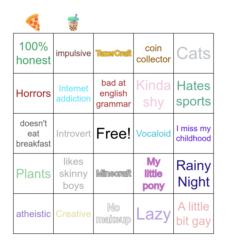This bingo card has a free space and 24 words: likes skinny boys, Creative, bad at english grammar, atheistic, Cats, 100% honest, Horrors, impulsive, Vocaloid, Minecraft, Kinda shy, doesn't eat breakfast, My little pony, Rainy Night, Internet addiction, Lazy, I miss my childhood, TazerCraft, Hates sports, Introvert, A little bit gay, Plants, coin collector and No makeup.