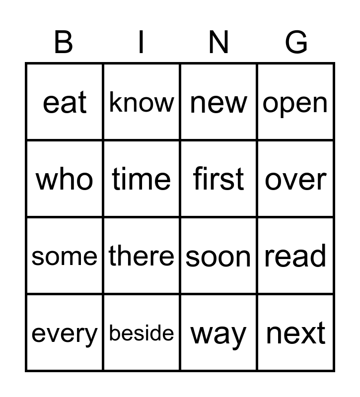 This bingo card has 16 words: beside, read, new, eat, some, know, soon, way, who, time, every, open, there, over, first and next.