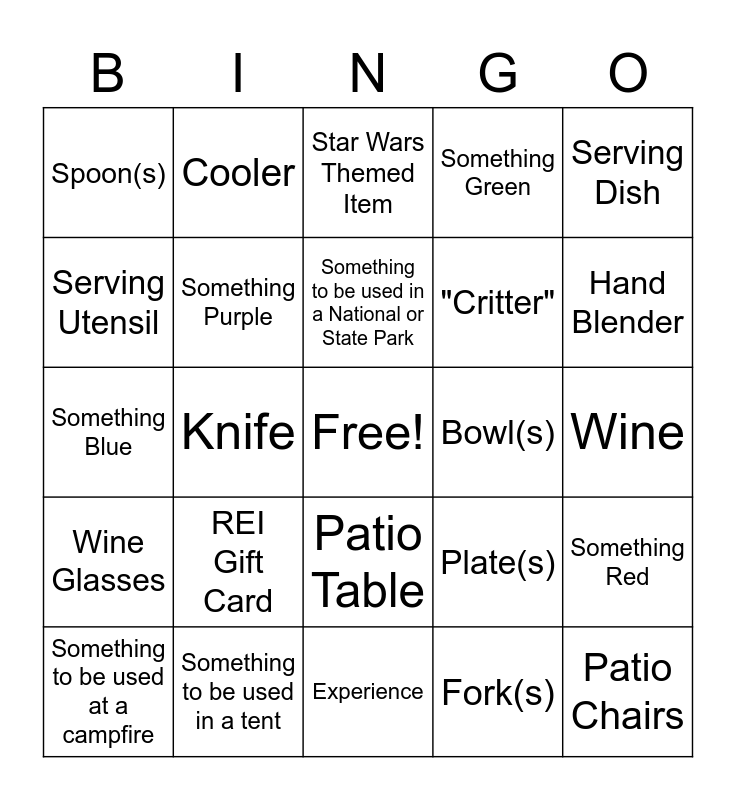 This bingo card has a free space and 27 words: Plate(s), Wine Opener, "Critter", Experience, Serving Utensil, Star Wars Themed Item, Cooler, Wine Glasses, Bowl(s), Something Red, Something Blue, Something Green, Something to be used at a campfire, Something to be used in a tent, Hand Blender, Something White, Something Purple, Something to be used in a National or State Park, REI Gift Card, Spoon(s), Wine, Fork(s), Knife, Patio Chairs, Patio Table, Serving Dish and Baking Dish.