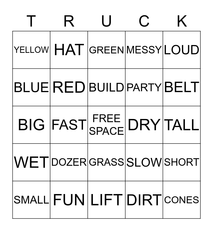 This bingo card has a free space and 24 words: DOZER, FUN, BUILD, SMALL, LOUD, YELLOW, BLUE, HAT, DRY, GRASS, PARTY, BIG, SLOW, SHORT, RED, DIRT, TALL, GREEN, BELT, FAST, CONES, WET, MESSY and LIFT.