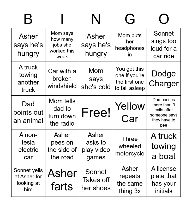 This bingo card has a free space and 24 words: Sonnet yells at Asher for looking at him, Asher pees on the side of the road, Mom says she's cold, Asher repeats the same thing 3x, Sonnet sings too loud for a car ride, Asher says he's hungry, Mom says how many jobs she worked this week, Asher says he's hungry, Yellow Car, Dad passes more than 3 exits after someone says they have to pee, Dad points out an animal, Car with a broken windshield, Three wheeled motorcycle, A truck towing a boat, A truck towing another truck, Asher farts, Sonnet Takes off her shoes, Mom puts her headphones in, Dodge Charger, A non-tesla electric car, Mom tells dad to turn down the radio, Asher asks to play video games, You get this one if you're the first one to fall asleep and A license plate that has your initials.