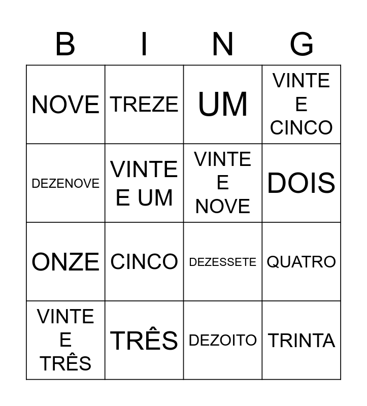 This bingo card has 16 words: TRÊS, QUATRO, UM, NOVE, ONZE, TREZE, DEZESSETE, DEZOITO, DEZENOVE, VINTE E UM, VINTE E TRÊS, VINTE E CINCO, CINCO, DOIS, VINTE E NOVE and TRINTA.