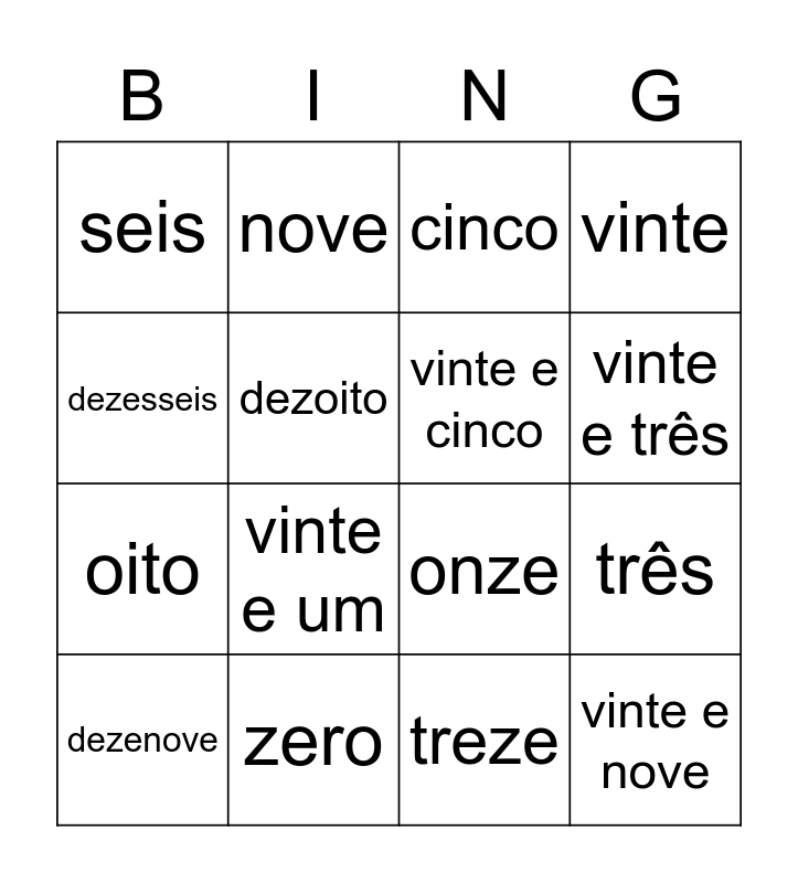 This bingo card has 16 words: zero, três, cinco, seis, oito, nove, onze, treze, dezesseis, dezoito, dezenove, vinte, vinte e um, vinte e três, vinte e cinco and vinte e nove.