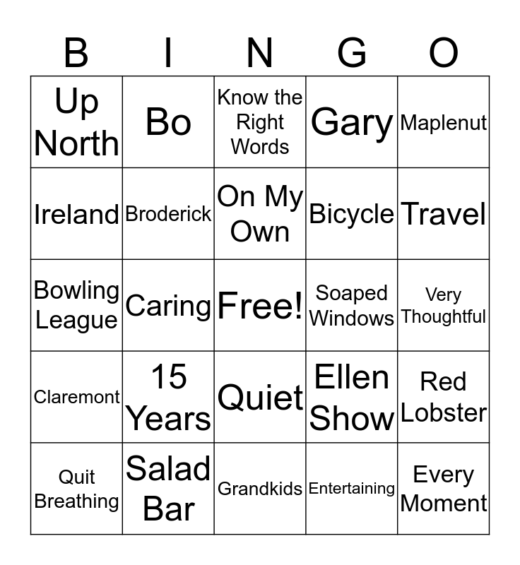 This bingo card has a free space and 24 words: 15 Years, Salad Bar, On My Own, Quit Breathing, Maplenut, Up North, Ireland, Bo, Soaped Windows, Quiet, Bicycle, Bowling League, Ellen Show, Red Lobster, Broderick, Entertaining, Very Thoughtful, Know the Right Words, Travel, Caring, Every Moment, Claremont, Gary and Grandkids.
