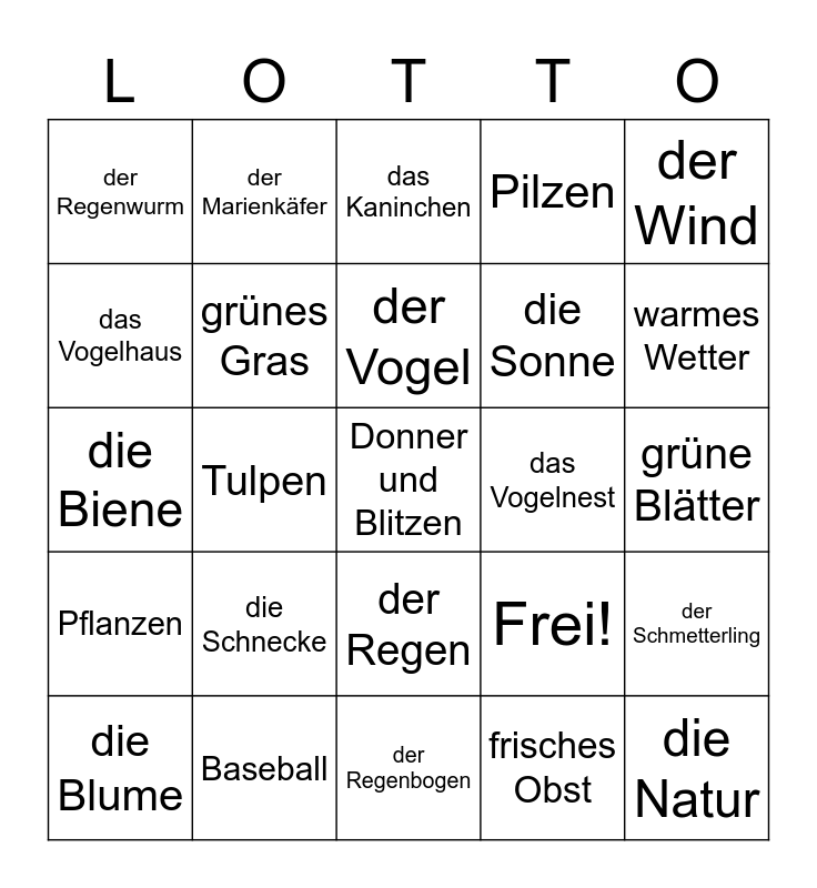 This bingo card has 25 words: die Schnecke, der Regenbogen, der Vogel, die Blume, der Wind, der Regenwurm, das Vogelhaus, der Marienkäfer, das Vogelnest, der Regen, die Sonne, die Biene, Frei!, der Schmetterling, grünes Gras, die Natur, grüne Blätter, das Kaninchen, warmes Wetter, Tulpen, Donner und Blitzen, Baseball, Pflanzen, Pilzen and frisches Obst.