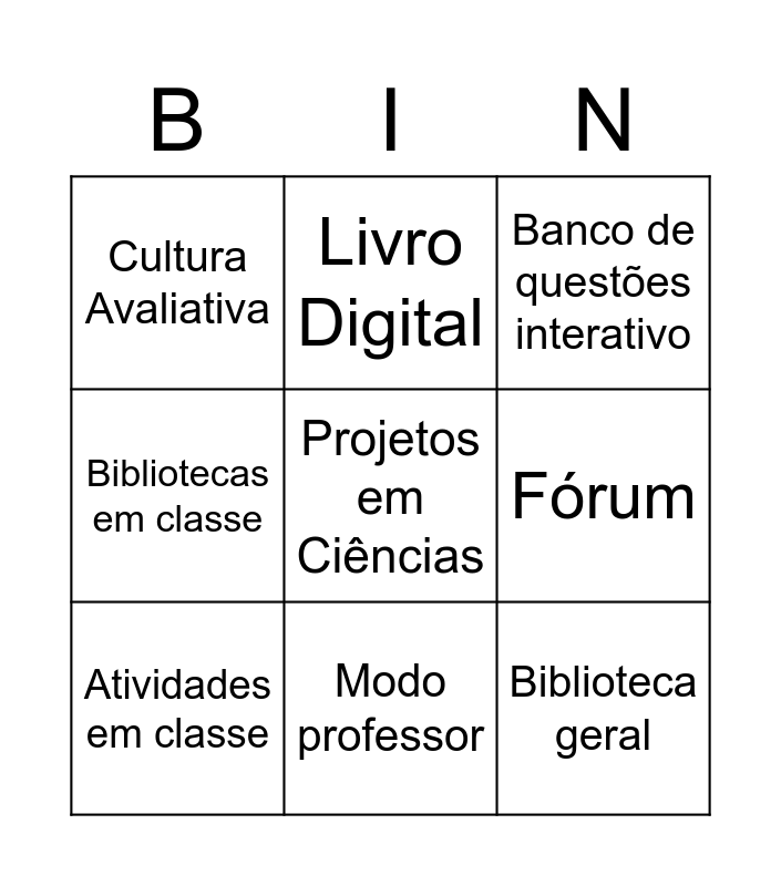 This bingo card has 9 words: Atividades em classe, Banco de questões interativo, Livro Digital, Bibliotecas em classe, Cultura Avaliativa, Fórum, Projetos em Ciências, Biblioteca geral and Modo professor.