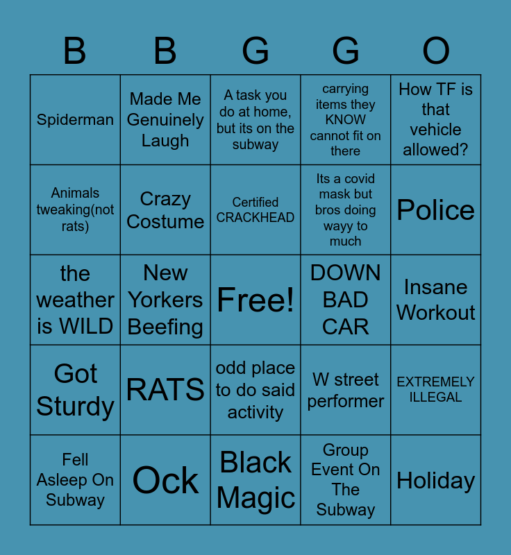 This bingo card has a free space and 24 words: RATS, Ock, Certified CRACKHEAD, Fell Asleep On Subway, How TF is that vehicle allowed?, Spiderman, Animals tweaking(not rats), Made Me Genuinely Laugh, DOWN BAD CAR, odd place to do said activity, Its a covid mask but bros doing wayy to much, the weather is WILD, W street performer, EXTREMELY ILLEGAL, Crazy Costume, Group Event On The Subway, Insane Workout, A task you do at home, but its on the subway, Police, New Yorkers Beefing, Holiday, Got Sturdy, carrying items they KNOW cannot fit on there and Black Magic.