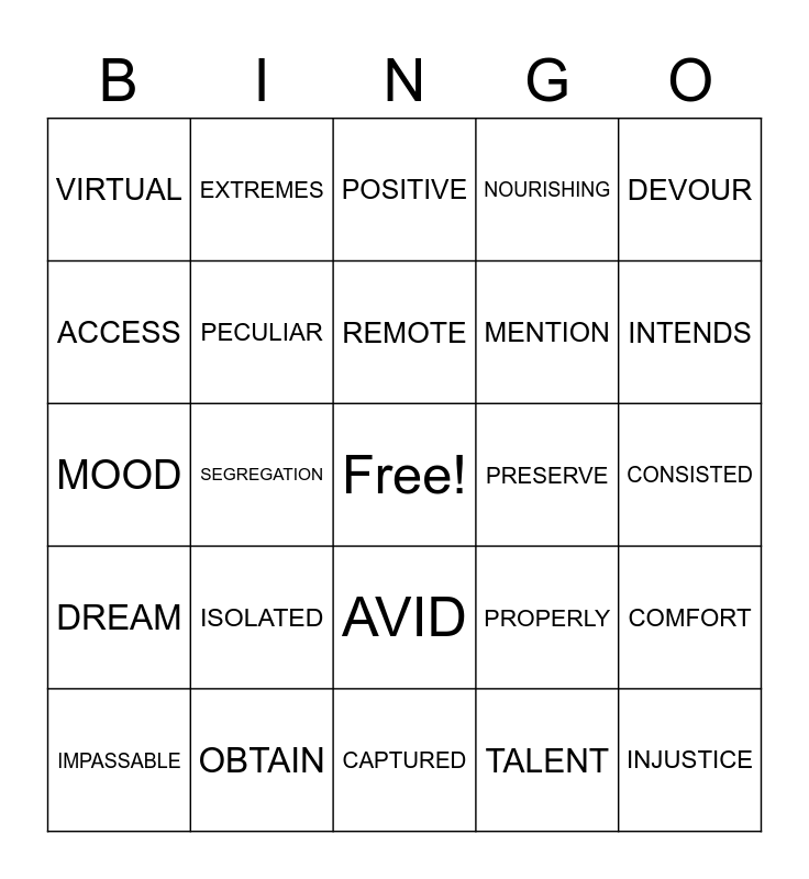 This bingo card has a free space and 24 words: ISOLATED, OBTAIN, REMOTE, IMPASSABLE, DEVOUR, VIRTUAL, ACCESS, EXTREMES, PRESERVE, AVID, MENTION, MOOD, PROPERLY, COMFORT, PECULIAR, TALENT, CONSISTED, POSITIVE, INTENDS, SEGREGATION, INJUSTICE, DREAM, NOURISHING and CAPTURED.