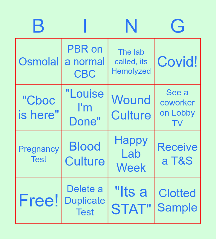 This bingo card has 23 words: Free!, Body Fluid, Blood Culture, "Its a STAT", Receive a T&S, Osmolal, PBR on a normal CBC, The lab called, its Hemolyzed, Clotted Sample, "How long until __ is done?", Delete a Duplicate Test, Wound Culture, Process a send out test, Missing Shared Specimen, Amikacin, Bell is rung, Covid!, "Cboc is here", "Louise I'm Done", Happy Lab Week, See a coworker on Lobby TV, Pregnancy Test and Wright Stain.