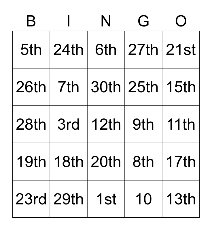 This bingo card has 31 words: 1st, 2nd, 3rd, 4th, 5th, 6th, 7th, 8th, 9th, 10, 11th, 12th, 13th, 14th, 15th, 16th, 17th, 18th, 19th, 20th, 21st, 22nd, 23rd, 24th, 25th, 26th, 27th, 28th, 29th, 30th and 31st.