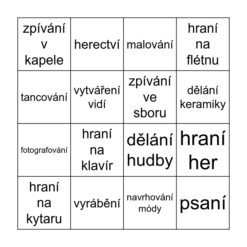 This bingo card has 16 words: vyrábění, hraní her, malování, zpívání v kapele, fotografování, herectví, dělání hudby, navrhování módy, tancování, vytváření vidí, hraní na kytaru, hraní na flétnu, hraní na klavír, dělání keramiky, zpívání ve sboru and psaní.