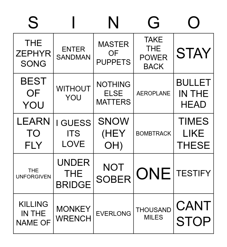 This bingo card has 25 words: UNDER THE BRIDGE, EVERLONG, NOTHING ELSE MATTERS, KILLING IN THE NAME OF, STAY, THE ZEPHYR SONG, BEST OF YOU, ENTER SANDMAN, BOMBTRACK, NOT SOBER, AEROPLANE, LEARN TO FLY, ONE, TESTIFY, WITHOUT YOU, CANT STOP, TIMES LIKE THESE, MASTER OF PUPPETS, BULLET IN THE HEAD, I GUESS ITS LOVE, SNOW (HEY OH), MONKEY WRENCH, THE UNFORGIVEN, TAKE THE POWER BACK and THOUSAND MILES.
