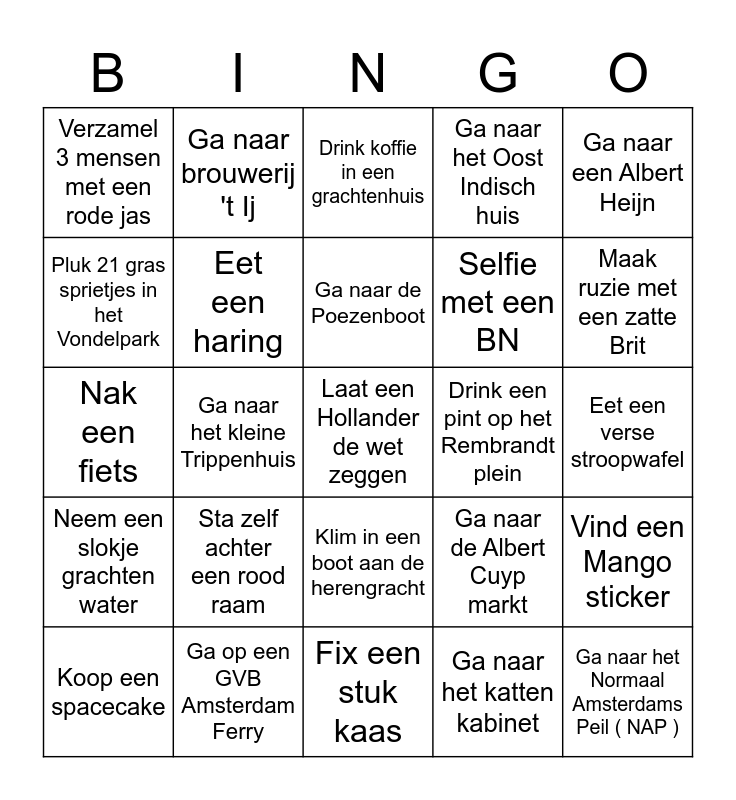 This bingo card has a free space and 24 words: Sta zelf achter een rood raam, Ga op een GVB Amsterdam Ferry, Ga naar de Poezenboot, Koop een spacecake, Ga naar een Albert Heijn, Verzamel 3 mensen met een rode jas, Pluk 21 gras sprietjes in het Vondelpark, Ga naar brouwerij 't Ij, Drink een pint op het Rembrandt plein, Klim in een boot aan de herengracht, Selfie met een BN, Nak een fiets, Ga naar de Albert Cuyp markt, Vind een Mango sticker, Eet een haring, Ga naar het katten kabinet, Eet een verse stroopwafel, Drink koffie in een grachtenhuis, Maak ruzie met een zatte Brit, Ga naar het kleine Trippenhuis, Ga naar het Normaal Amsterdams Peil ( NAP ), Neem een slokje grachten water, Ga naar het Oost Indisch huis and Fix een stuk kaas.