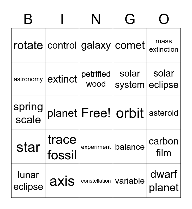 This bingo card has a free space and 38 words: fossil, cast, mold, extinct, carbon film, trace fossil, petrified wood, index fossil, mass extinction, solar system, planet, comet, dwarf planet, asteroid, astronomy, star, universe, galaxy, revolve, orbit, rotate, axis, solar eclipse, lunar eclipse, moon phase, constellation, investigation, science, evidence, opinion, scientific method, experiment, variable, control, microscopic, balance, spring scale and accurate.