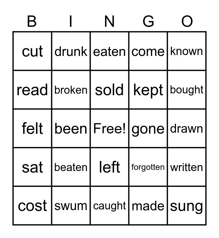 This bingo card has a free space and 24 words: cost, beaten, sold, made, known, cut, drunk, eaten, gone, drawn, felt, broken, forgotten, written, read, swum, caught, come, bought, sat, been, left, kept and sung.