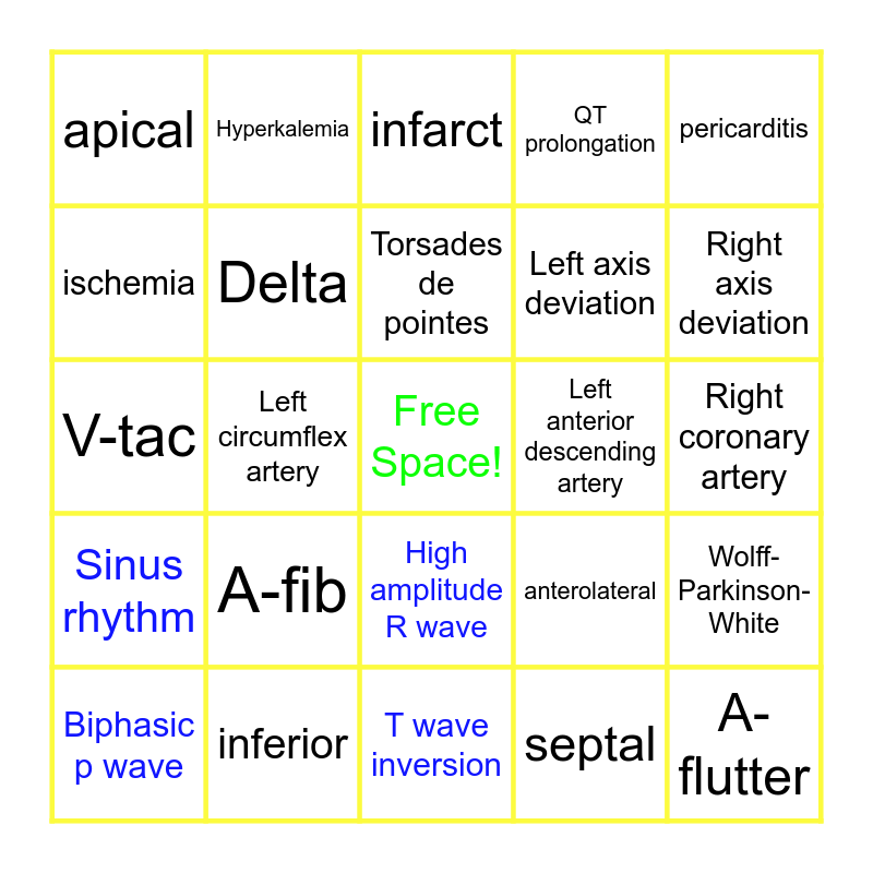 This bingo card has a free space and 24 words: A-fib, inferior, Torsades de pointes, Biphasic p wave, pericarditis, apical, ischemia, Hyperkalemia, Left anterior descending artery, High amplitude R wave, Left axis deviation, V-tac, anterolateral, Wolff-Parkinson-White, Delta, septal, Right coronary artery, infarct, Right axis deviation, Left circumflex artery, A-flutter, Sinus rhythm, QT prolongation and T wave inversion.