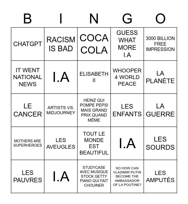 This bingo card has a free space and 24 words: LES AVEUGLES, I.A, ELISABETH II, LES PAUVRES, 3000 BILLION FREE IMPRESSION, CHATGPT, IT WENT NATIONAL NEWS, RACISM IS BAD, LES ENFANTS, TOUT LE MONDE EST BEAUTIFUL, WHOOPER 4 WORLD PEACE, LE CANCER, I.A, LES SOURDS, I.A, SO HOW CAN VLADIMIR PUTIN BECOME THE AMBASSADOR OF LA POUTINE?, LA GUERRE, COCA COLA, LA PLANÈTE, ARTISTS VS. MIDJOURNEY, LES AMPUTÉS, MOTHERS ARE SUPERHEROES, GUESS WHAT MORE I.A and STUDYCASE AVEC MUSIQUE STOCK GETTY PIANO QUI FAIT CHOUINER.
