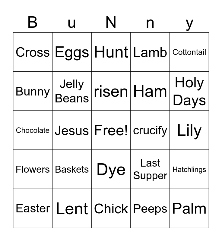 This bingo card has a free space and 24 words: Easter, Baskets, risen, Peeps, Cottontail, Cross, Eggs, Hunt, crucify, Lily, Chocolate, Jelly Beans, Last Supper, Hatchlings, Bunny, Lent, Chick, Lamb, Holy Days, Flowers, Jesus, Dye, Ham and Palm.