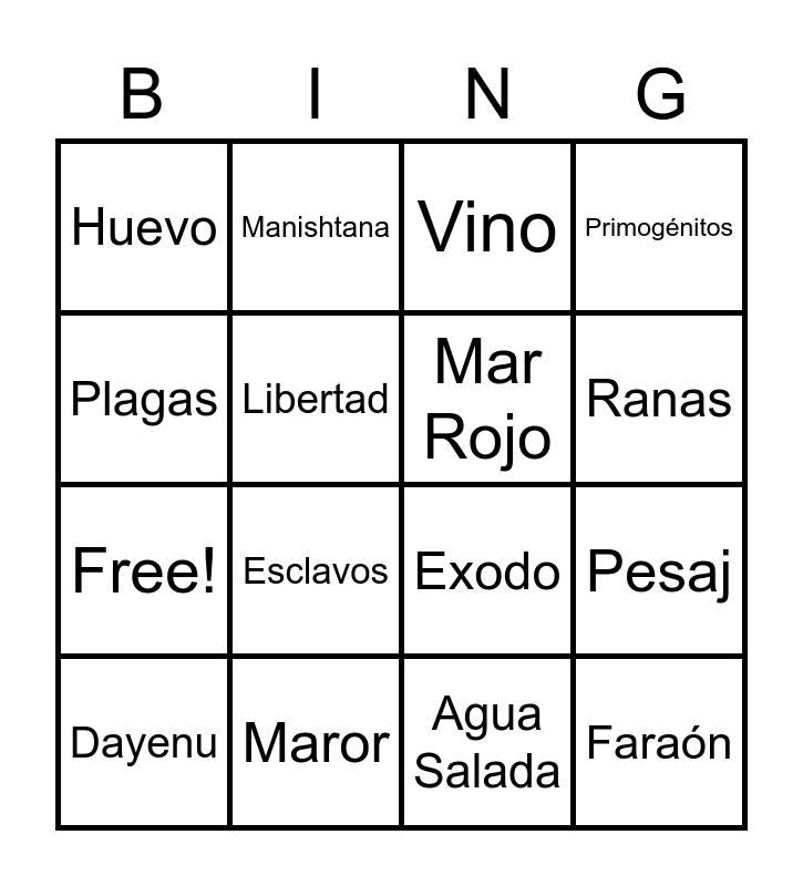 This bingo card has 20 words: Pesaj, Matzá, Vino, Jaroset, Dayenu, Plagas, Maror, Huevo, Free!, Manishtana, Esclavos, Exodo, Libertad, Faraón, Mar Rojo, Moises, Ranas, Primogénitos, Agua Salada and 2 Copa.