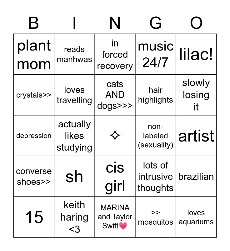 This bingo card has a free space and 24 words: sh, keith haring <3, cats AND dogs>>>, 15, lilac!, plant mom, crystals>>, reads manhwas, non-labeled (sexuality), cis girl, hair highlights, depression, lots of intrusive thoughts, brazilian, loves travelling, >> mosquitos, artist, in forced recovery, slowly losing it, actually likes studying, loves aquariums, converse shoes>>, music 24/7 and MARINA and Taylor Swift💗.