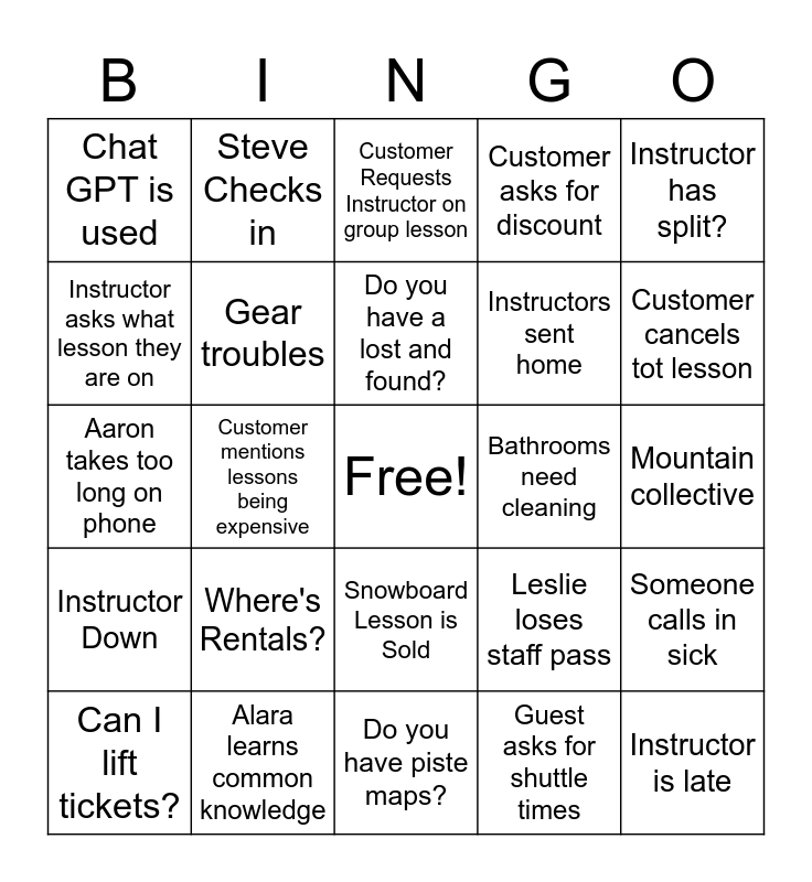 This bingo card has a free space and 25 words: Where's Rentals?, Do you have piste maps?, Do you have a lost and found?, Can I lift tickets?, Instructor has split?, Chat GPT is used, Instructor asks what lesson they are on, Steve Checks in, Bathrooms need cleaning, Snowboard Lesson is Sold, Instructors sent home, Aaron takes too long on phone, Leslie loses staff pass, Someone calls in sick, Gear troubles, Customer phones wrong department, Mountain collective, Customer Requests Instructor on group lesson, Customer cancels tot lesson, Customer mentions lessons being expensive, Instructor is late, Alara learns common knowledge, Instructor Down, Customer asks for discount and Guest asks for shuttle times.