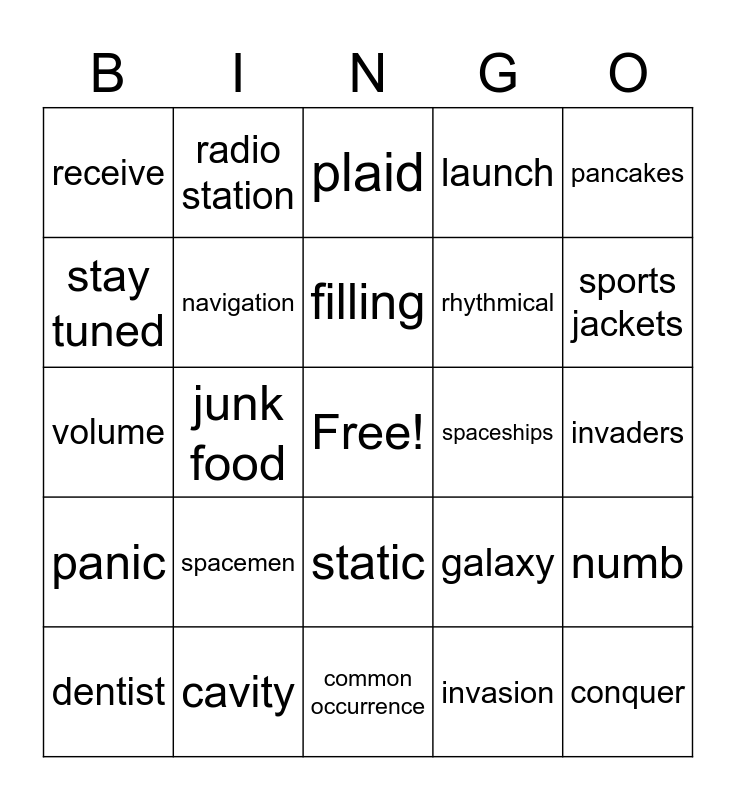 This bingo card has a free space and 24 words: spacemen, cavity, filling, dentist, pancakes, receive, stay tuned, radio station, spaceships, static, rhythmical, volume, galaxy, numb, navigation, invasion, invaders, plaid, sports jackets, junk food, conquer, panic, launch and common occurrence.