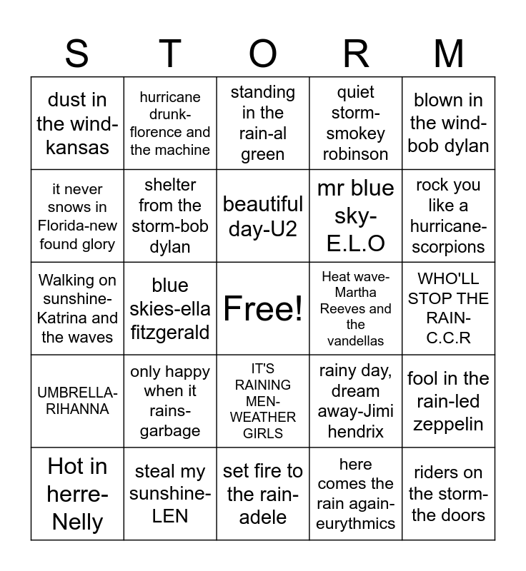 This bingo card has a free space and 52 words: storms-fleetwood mac, riders on the storm-the doors, purple rain-prince, set fire to the rain-adele, only happy when it rains-garbage, no rain-blind melon, hurricane drunk-florence and the machine, thunderstruck-ac/dc, it never snows in Florida-new found glory, the rain(supa dupa fly)- missy elliot, shelter from the storm-bob dylan, lightning crashes-live, fool in the rain-led zeppelin, rainy day, dream away-Jimi hendrix, rain-the beatles, here comes the sun-the beatles, beautiful day-U2, Heat wave- Martha Reeves and the vandellas, walking in the rain-the ronettes, blown in the wind-bob dylan, blue skies-ella fitzgerald, here comes the rain again-eurythmics, dust in the wind-kansas, mr blue sky-E.L.O, fire and rain-jams Taylor, have you ever seen the rain-C.C.R, HOLD BACK THE RAIN-DURAN DURAN, HURRICANE-BOB DYLAN, rock you like a hurricane-scorpions, it's raining again-super tramp, keep on the sunny side-the whites, quiet storm-smokey robinson, RAIN DROPS KEEP FALLING ON MY HEAD-Barry manilow, rhapsody in the rain-you christie, snow(hey oh) red hot chili peppers, standing in the rain-al green, steal my sunshine-LEN, WALKING ON SUNSHINE-KATRINA AND THE WAVES, SUNSHINE OF YOUR LOVE-CREAM, THUNDER-IMAGINE DRAGONS, WHEN IT RAINS-PARAMORE, WHO'LL STOP THE RAIN-C.C.R, UMBRELLA-RIHANNA, CALIFORNIA DREAMIN-MAMAS AND THE PAPAS, IT'S RAINING MEN-WEATHER GIRLS, Baby it's cold outside- Zooey Deschanel, Summer Breeze-Seals and Crofts, Walking on sunshine-Katrina and the waves, Wind beneath my wings-Bette Midler, Ain't no sunshine-Bill Withers, Hot in herre-Nelly and Cold as ice-Foreigner.