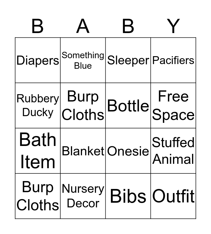 This bingo card has a free space and 15 words: Burp Cloths, Outfit, Sleeper, Diapers, Free Space, Rubbery Ducky, Blanket, Bibs, Burp Cloths, Bath Item, Stuffed Animal, Pacifiers, Bottle, Something Blue and Nursery Decor.