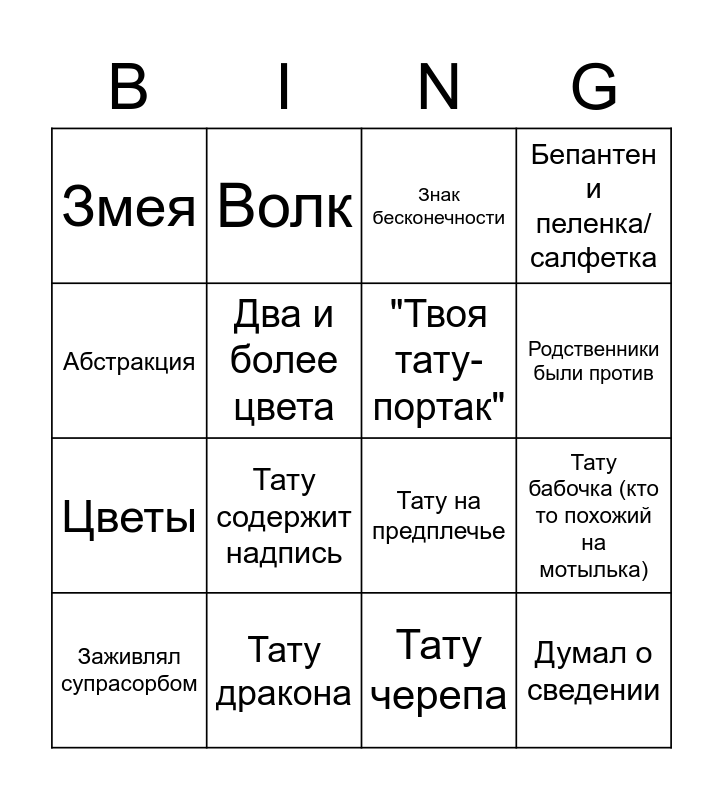 This bingo card has 16 words: Тату дракона, Тату бабочка (кто то похожий на мотылька), Знак бесконечности, Змея, Цветы, Волк, Тату на предплечье, Тату черепа, Абстракция, Два и более цвета, Заживлял супрасорбом, Бепантен и пеленка/ салфетка, Тату содержит надпись, Родственники были против, "Твоя тату- портак" and Думал о сведении.