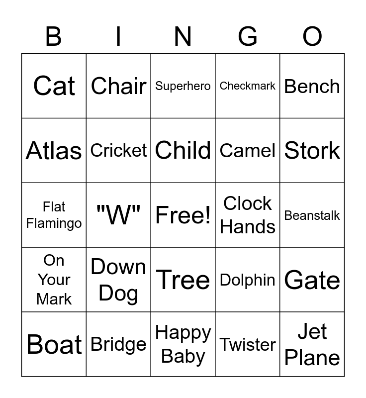 This bingo card has a free space and 24 words: Down Dog, Bridge, Child, Boat, Bench, Cat, Atlas, Chair, Clock Hands, Tree, Camel, Flat Flamingo, Dolphin, Gate, Cricket, Twister, Beanstalk, Superhero, Stork, "W", Jet Plane, On Your Mark, Checkmark and Happy Baby.