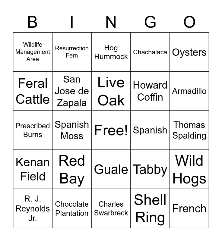 This bingo card has a free space and 24 words: Red Bay, Chocolate Plantation, Live Oak, R. J. Reynolds Jr., Oysters, Wildlife Management Area, Feral Cattle, Resurrection Fern, Spanish, Guale, Howard Coffin, Prescribed Burns, Tabby, Wild Hogs, San Jose de Zapala, Shell Ring, Thomas Spalding, Hog Hummock, Armadillo, Spanish Moss, French, Kenan Field, Chachalaca and Charles Swarbreck.