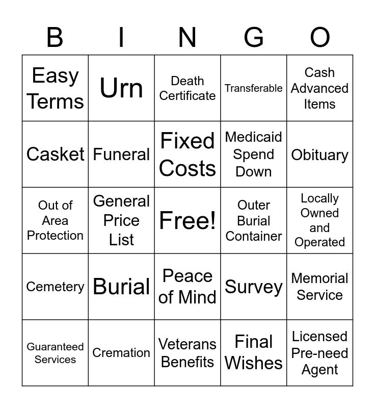 This bingo card has a free space and 24 words: Burial, Cremation, Fixed Costs, Guaranteed Services, Cash Advanced Items, Easy Terms, Casket, Urn, Outer Burial Container, Peace of Mind, Medicaid Spend Down, Out of Area Protection, Survey, Memorial Service, Funeral, Final Wishes, Locally Owned and Operated, Death Certificate, Obituary, General Price List, Licensed Pre-need Agent, Cemetery, Transferable and Veterans Benefits.