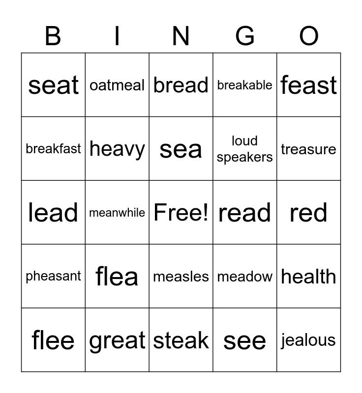 This bingo card has a free space and 24 words: flee, flea, sea, see, feast, seat, oatmeal, bread, read, red, lead, heavy, meadow, health, breakfast, great, steak, breakable, treasure, pheasant, meanwhile, measles, loud speakers and jealous.