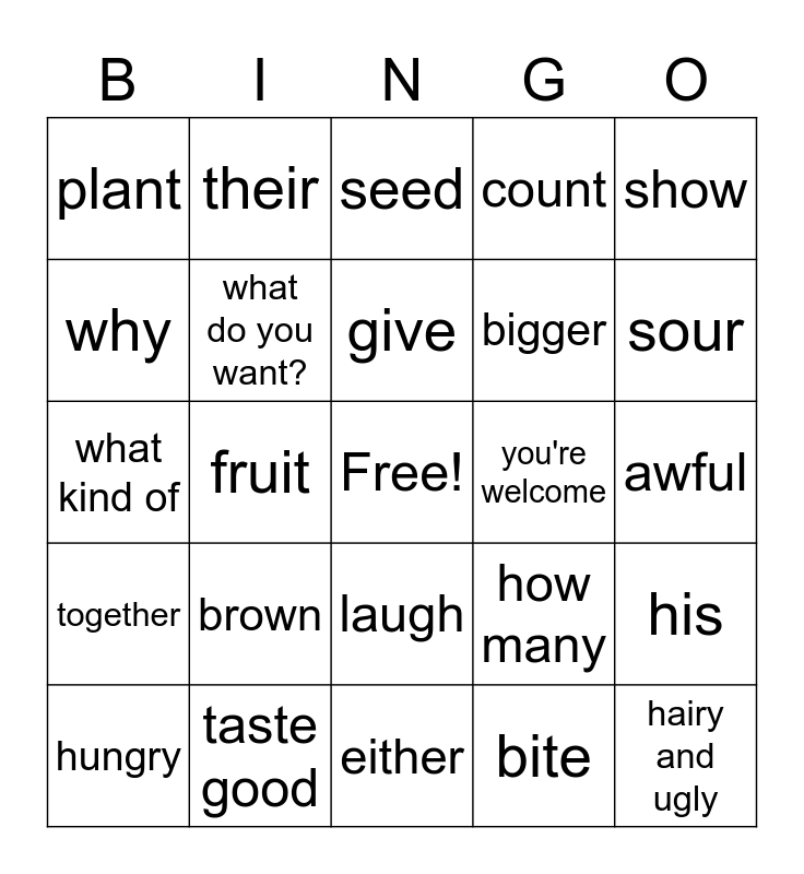 This bingo card has a free space and 29 words: hungry, kitchen, fruit, answer, plant, seed, what do you want?, brown, you're welcome, taste good, awful, hairy and ugly, either, bite, sour, try, laugh, together, show, what kind of, how many, talk, bigger, why, count, their, his, give and some.