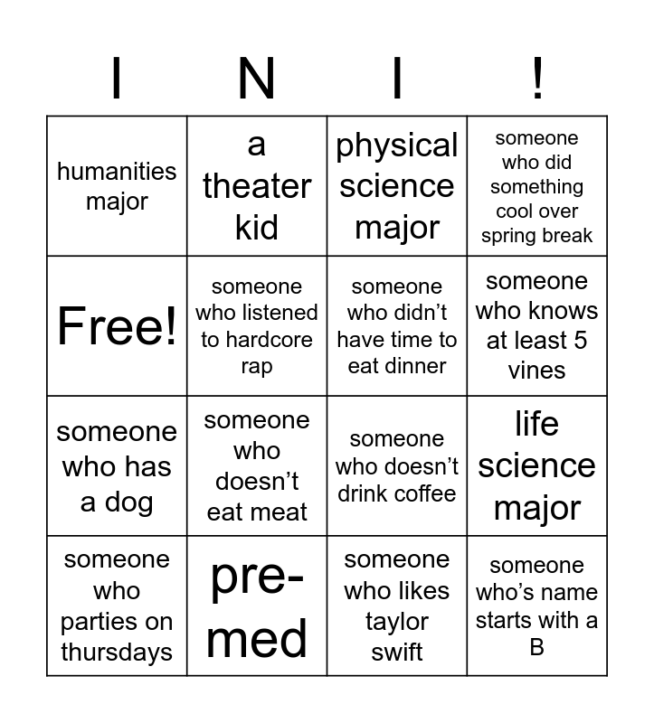 This bingo card has 16 words: pre-med, life science major, physical science major, humanities major, someone who has a dog, a theater kid, someone who doesn’t drink coffee, someone who likes taylor swift, Free!, someone who listened to hardcore rap, someone who parties on thursdays, someone who did something cool over spring break, someone who doesn’t eat meat, someone who knows at least 5 vines, someone who didn’t have time to eat dinner and someone who’s name starts with a B.