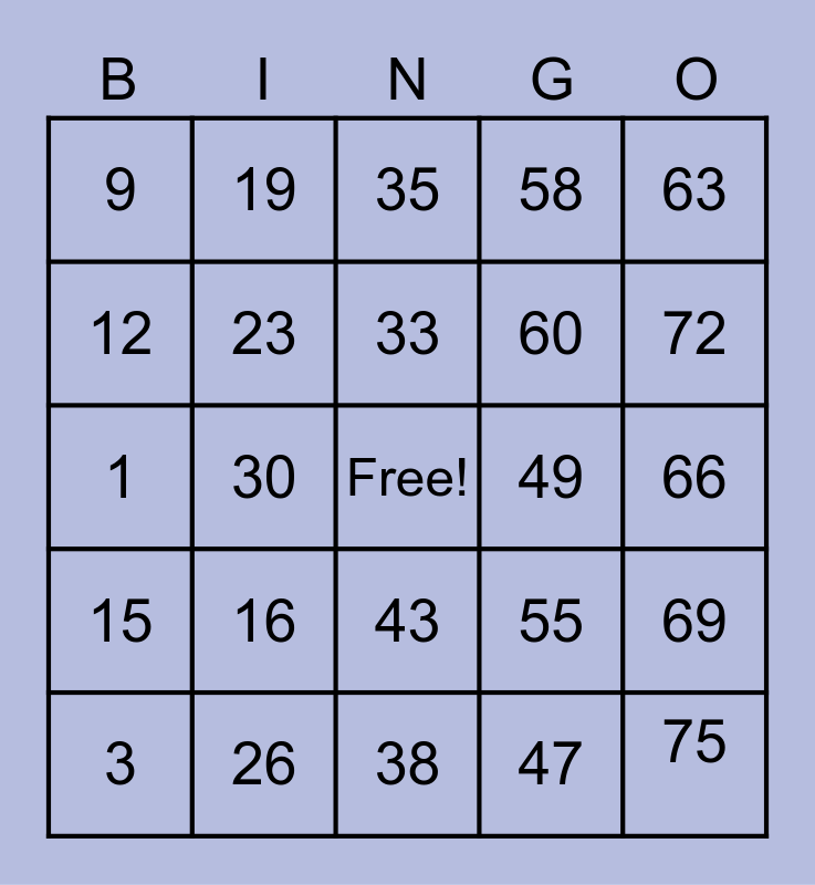 This bingo card has a free space and 24 words: 3, 16, 33, 47, 63, 9, 19, 35, 49, 66, 1, 23, 55, 69, 12, 26, 38, 58, 72, 15, 30, 43, 60 and 75.