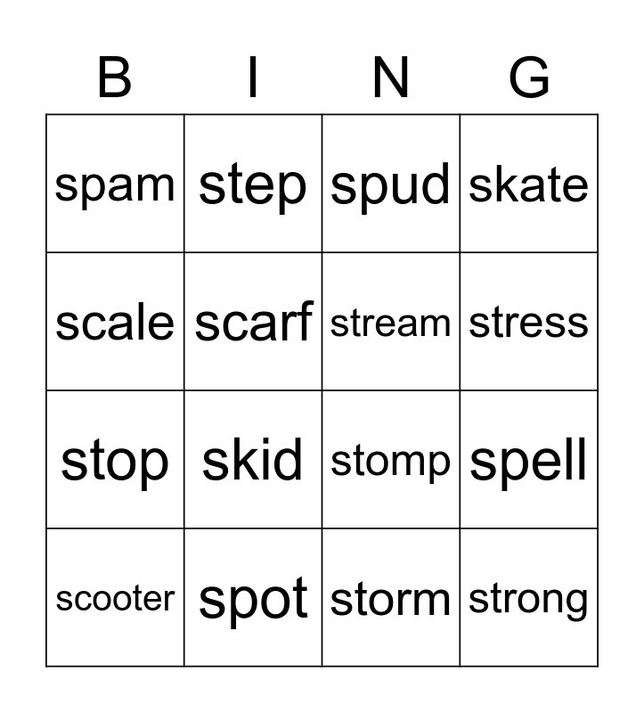 This bingo card has 16 words: spot, spell, spud, spam, stop, step, stomp, storm, scale, scarf, scooter, skate, skid, stress, stream and strong.