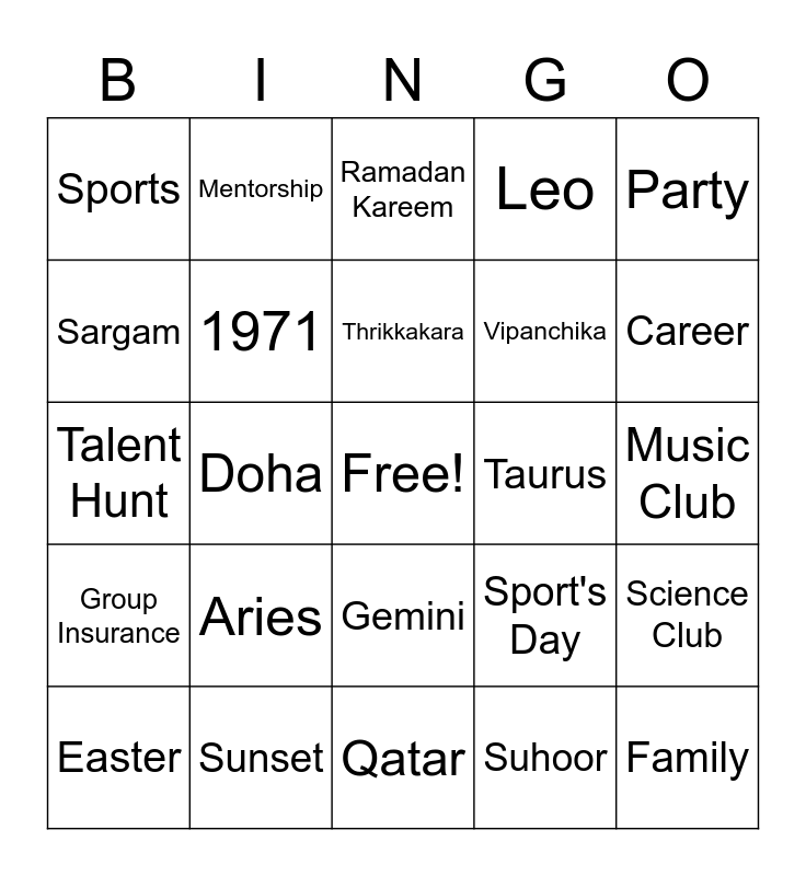 This bingo card has a free space and 43 words: Daffodil, Family, Spring, Easter, Bonnet, Suhoor, Ramadan Kareem, Eid al fitr, Party, Sunset, Leo, Taurus, Gemini, Aries, CUSAT, Qatar, Charity, Talent Hunt, Meetups, Career, Mentorship, Arts, Events, Sports, EngineersForum, Music Club, Dance Club, Debate Club, Sport's Day, Group Insurance, Reading Club, Science Club, Games, Doha, 2023, ICH, TD, Thrikkakara, Sargam, Vipanchika, Talentime, 1971 and 1995.