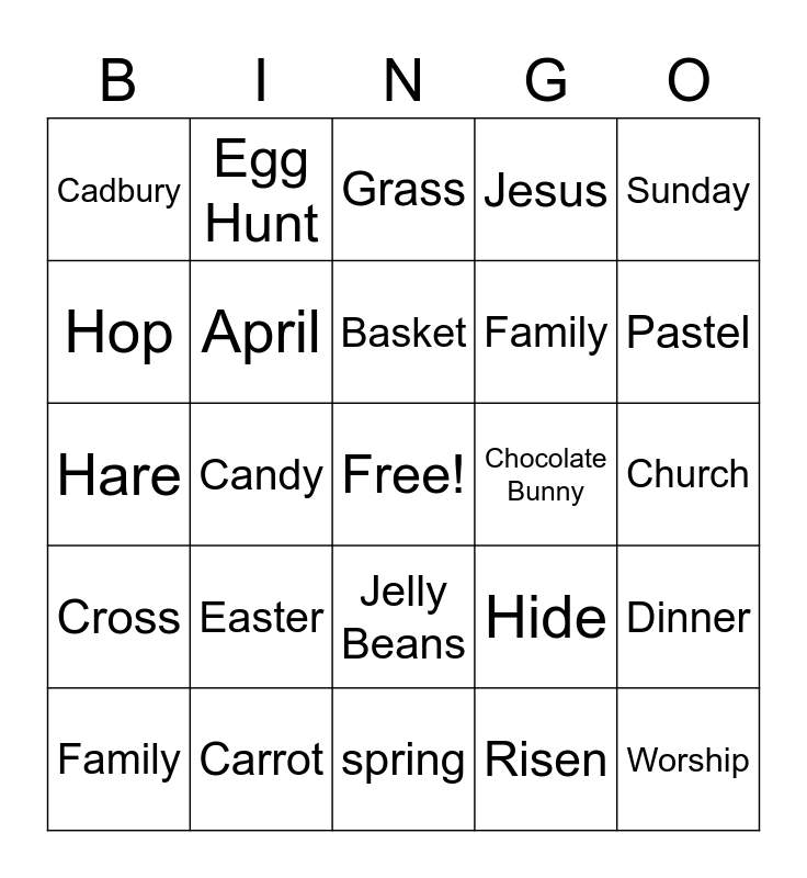 This bingo card has a free space and 25 words: Easter, spring, Basket, Family, Sunday, Cadbury, Hop, Egg Hunt, Chocolate Bunny, Jelly Beans, Family, Hare, Hide, Dinner, April, Tomb, Church, Grass, Pastel, Candy, Worship, Carrot, Cross, Jesus and Risen.