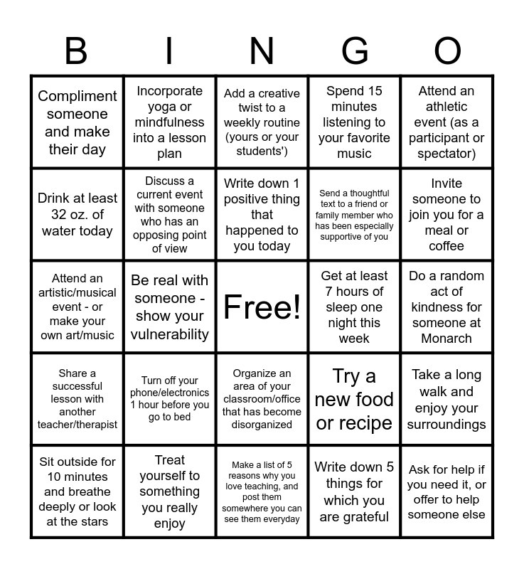 This bingo card has a free space and 24 words: Turn off your phone/electronics 1 hour before you go to bed, Treat yourself to something you really enjoy, Write down 1 positive thing that happened to you today, Sit outside for 10 minutes and breathe deeply or look at the stars, Attend an athletic event (as a participant or spectator), Compliment someone and make their day, Drink at least 32 oz. of water today, Incorporate yoga or mindfulness into a lesson plan, Get at least 7 hours of sleep one night this week, Organize an area of your classroom/office that has become disorganized, Send a thoughtful text to a friend or family member who has been especially supportive of you, Attend an artistic/musical event - or make your own art/music, Try a new food or recipe, Take a long walk and enjoy your surroundings, Discuss a current event with someone who has an opposing point of view, Write down 5 things for which you are grateful, Do a random act of kindness for someone at Monarch, Add a creative twist to a weekly routine (yours or your students'), Invite someone to join you for a meal or coffee, Be real with someone - show your vulnerability, Ask for help if you need it, or offer to help someone else, Share a successful lesson with another teacher/therapist, Spend 15 minutes listening to your favorite music and Make a list of 5 reasons why you love teaching, and post them somewhere you can see them everyday.