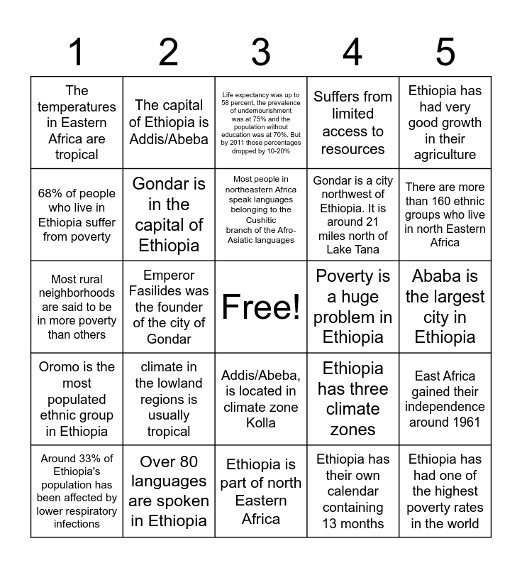 This bingo card has a free space and 24 words: Around 33% of Ethiopia's population has been affected by lower respiratory infections, climate in the lowland regions is usually tropical, Most people in northeastern Africa speak languages belonging to the Cushitic branch of the Afro-Asiatic languages, Ethiopia has their own calendar containing 13 months, Ethiopia has had very good growth in their agriculture, The temperatures in Eastern Africa are tropical, The capital of Ethiopia is Addis/Abeba, Life expectancy was up to 58 percent, the prevalence of undernourishment was at 75% and the population without education was at 70%. But by 2011 those percentages dropped by 10-20%, Poverty is a huge problem in Ethiopia, Ababa is the largest city in Ethiopia, Most rural neighborhoods are said to be in more poverty than others, Gondar is in the capital of Ethiopia, Ethiopia has three climate zones, East Africa gained their independence around 1961, 68% of people who live in Ethiopia suffer from poverty, Over 80 languages are spoken in Ethiopia, Ethiopia is part of north Eastern Africa, Suffers from limited access to resources, There are more than 160 ethnic groups who live in north Eastern Africa, Oromo is the most populated ethnic group in Ethiopia, Emperor Fasilides was the founder of the city of Gondar, Addis/Abeba, is located in climate zone Kolla, Gondar is a city northwest of Ethiopia. It is around 21 miles north of Lake Tana and Ethiopia has had one of the highest poverty rates in the world.